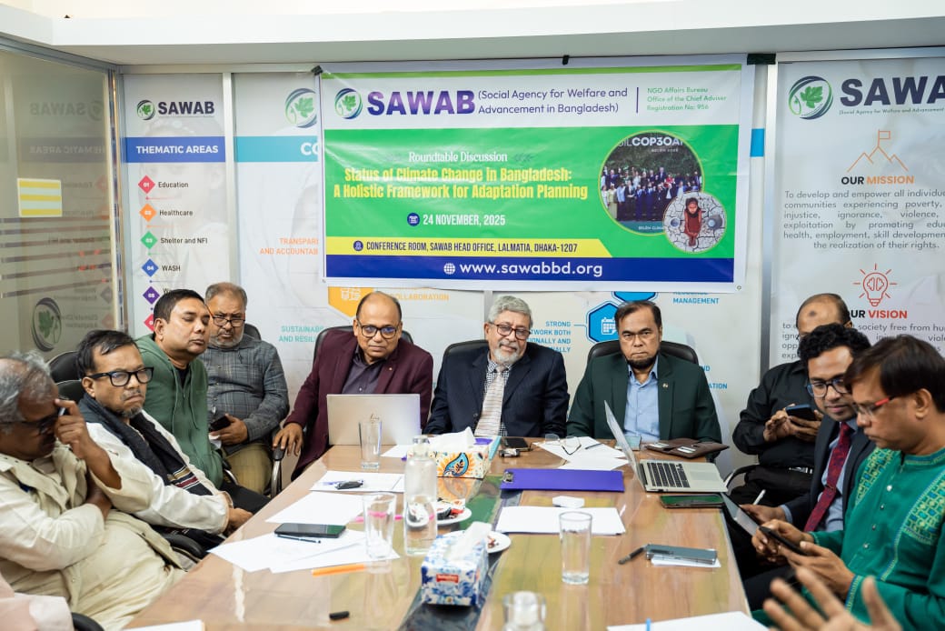 আজ রাজধানীর লালমাটিয়ায় ছওয়াবের উদ্যোগে আয়োজিত "স্ট্যাটাস অব ক্লাইমেট চেইঞ্জ ইন বাংলাদেশ: এ হলিস্টিক ফ্রেমওয়ার্ক ফর এডাপটেশন প্ল্যানিং" শীর্ষক গোলটেবিল বৈঠকে প্রধান অতিথির বক্তব্যে মানারাত ইন্টারন্যাশনাল ইউনিভার্সিটির ভাইস চ্যান্সেলর প্রফেসর ড. মোহাম্মদ আব্দুর রব এই কথা বলেন।