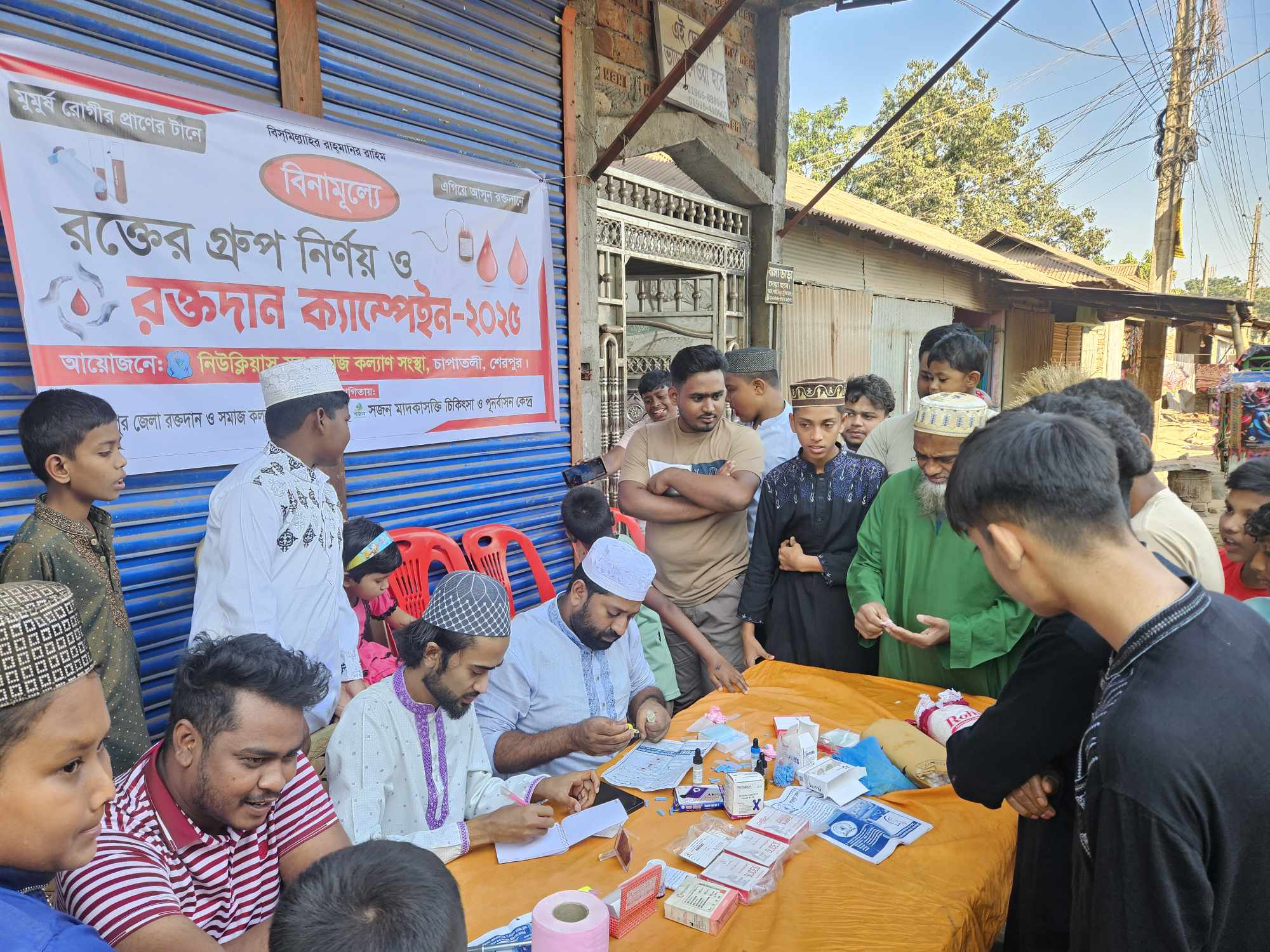 অদ্য ২৮/০৯/২০২৫ রোজ শুক্রবার শেরপুর জেলা শহরের চাপাতলী মডেল মসজিদ এর সম্মুখে সেচ্ছাসেবী সংগঠন "নিউক্লিয়াস যুব সমাজ কল্যান সংস্থার" উদ্যোগে বিনামূল্যে রক্তের গ্রুপ নির্ণয় ও রক্তদান কর্মসূচি পালন করা হয়।